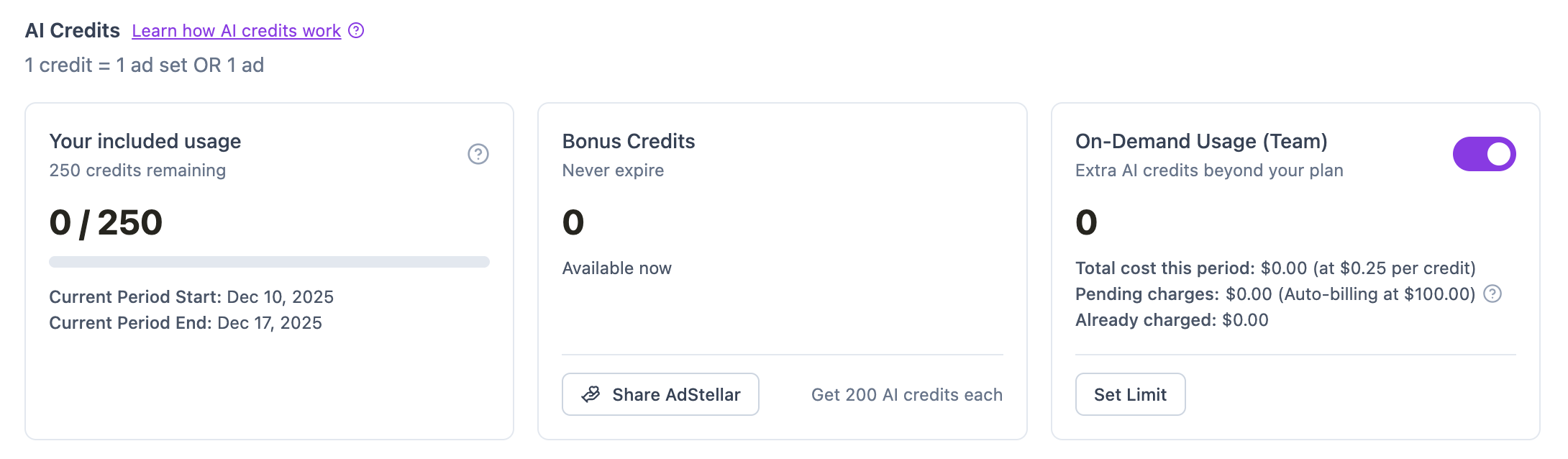 If you have billing or credit questions not answered here, our team is here to help.- Email: support@adstellar.ai