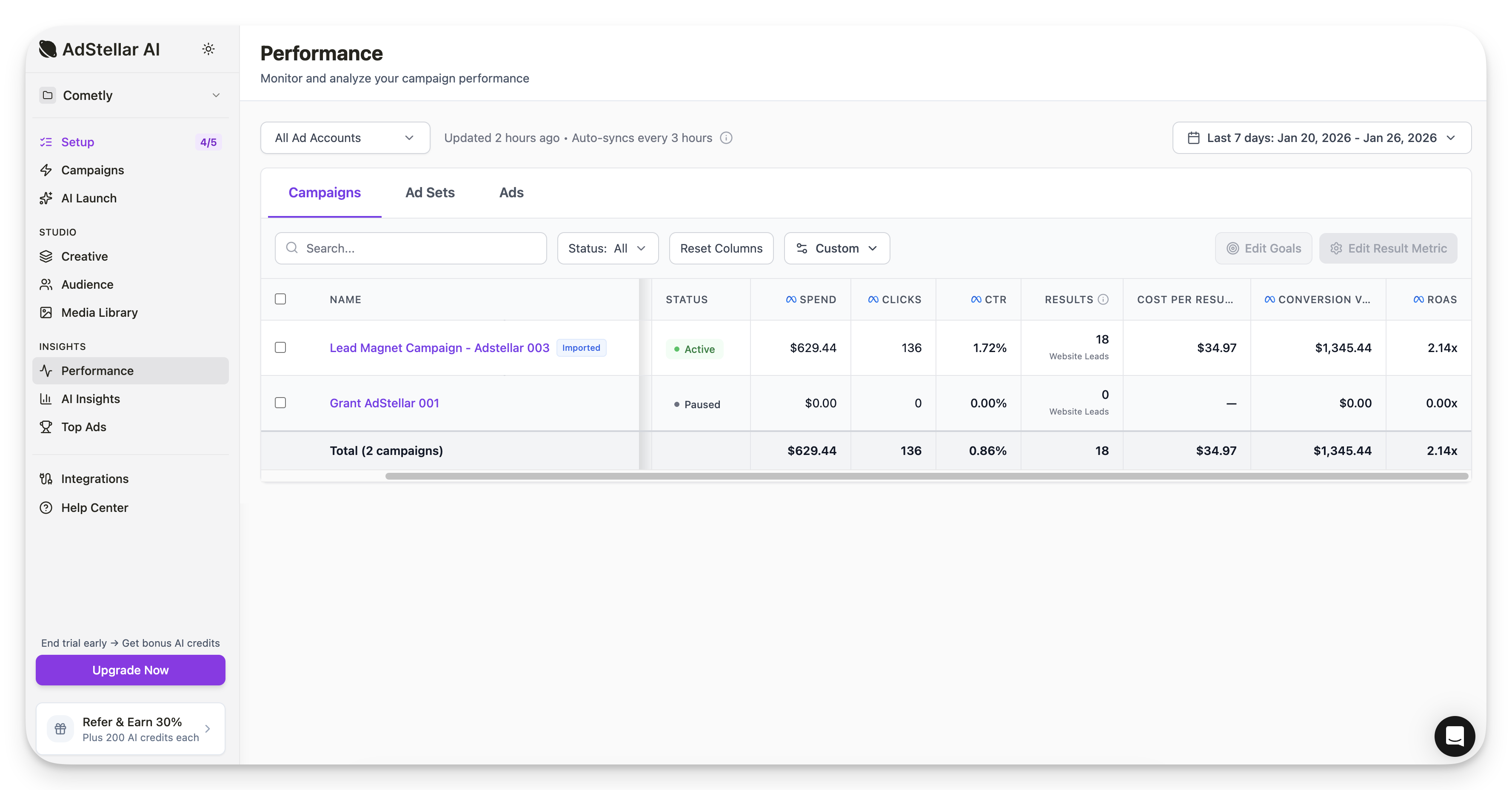 After importing your campaigns and setting goals, the Performance page displays your key metrics:- Results (website leads, purchases, etc.)