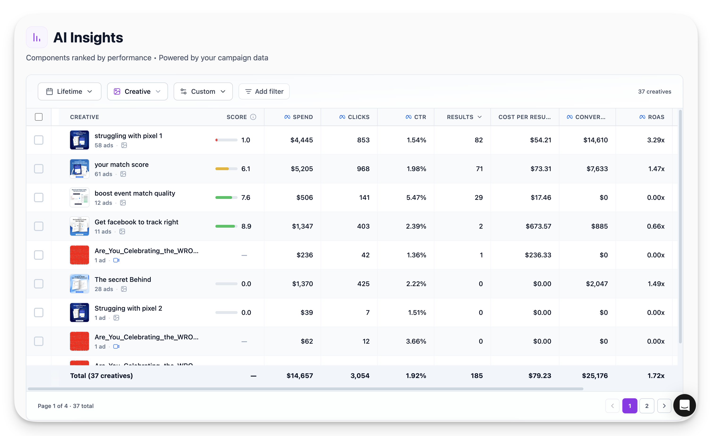 On the AI Insights page, select Creative to see performance data for each creative asset.