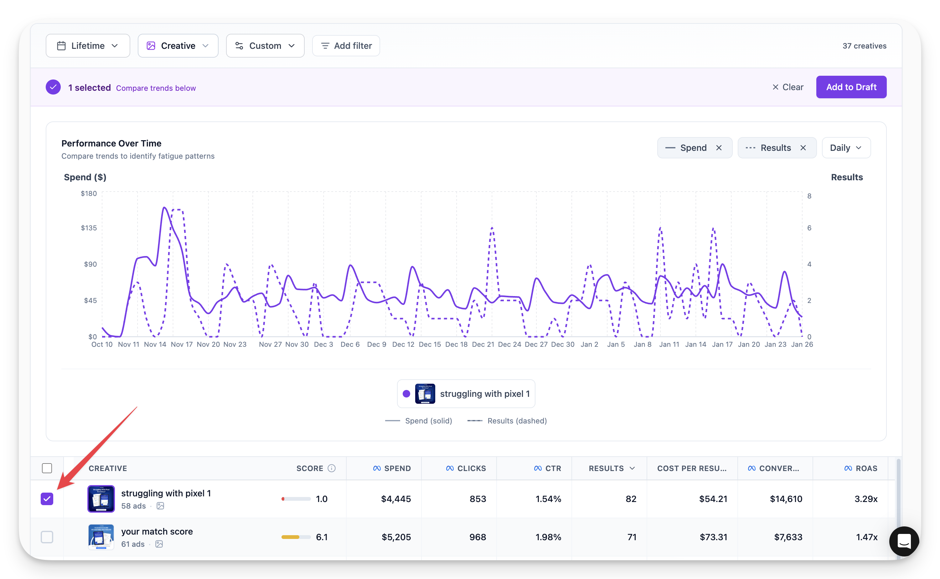 Click on any creative in the list to open its detailed performance view.
