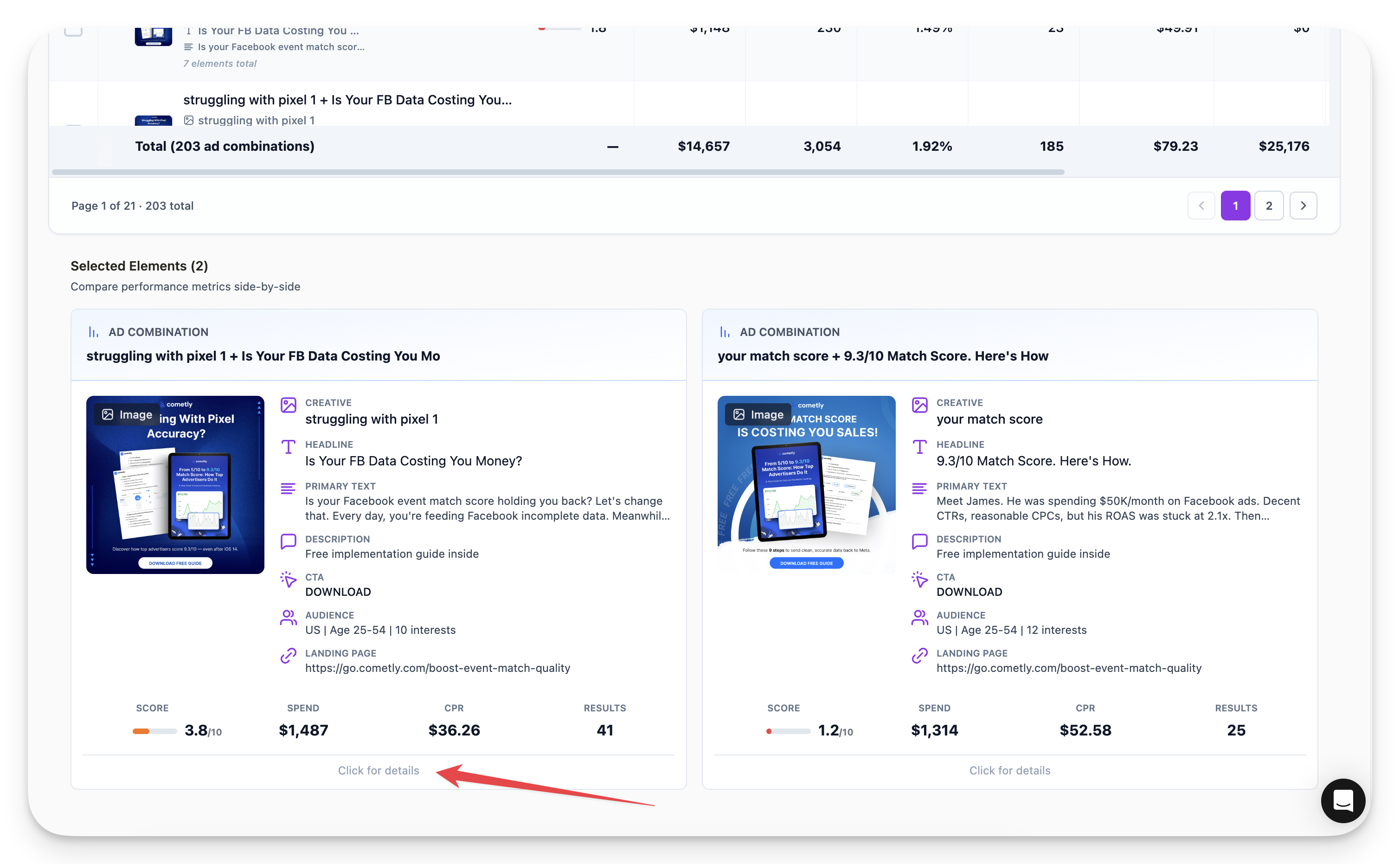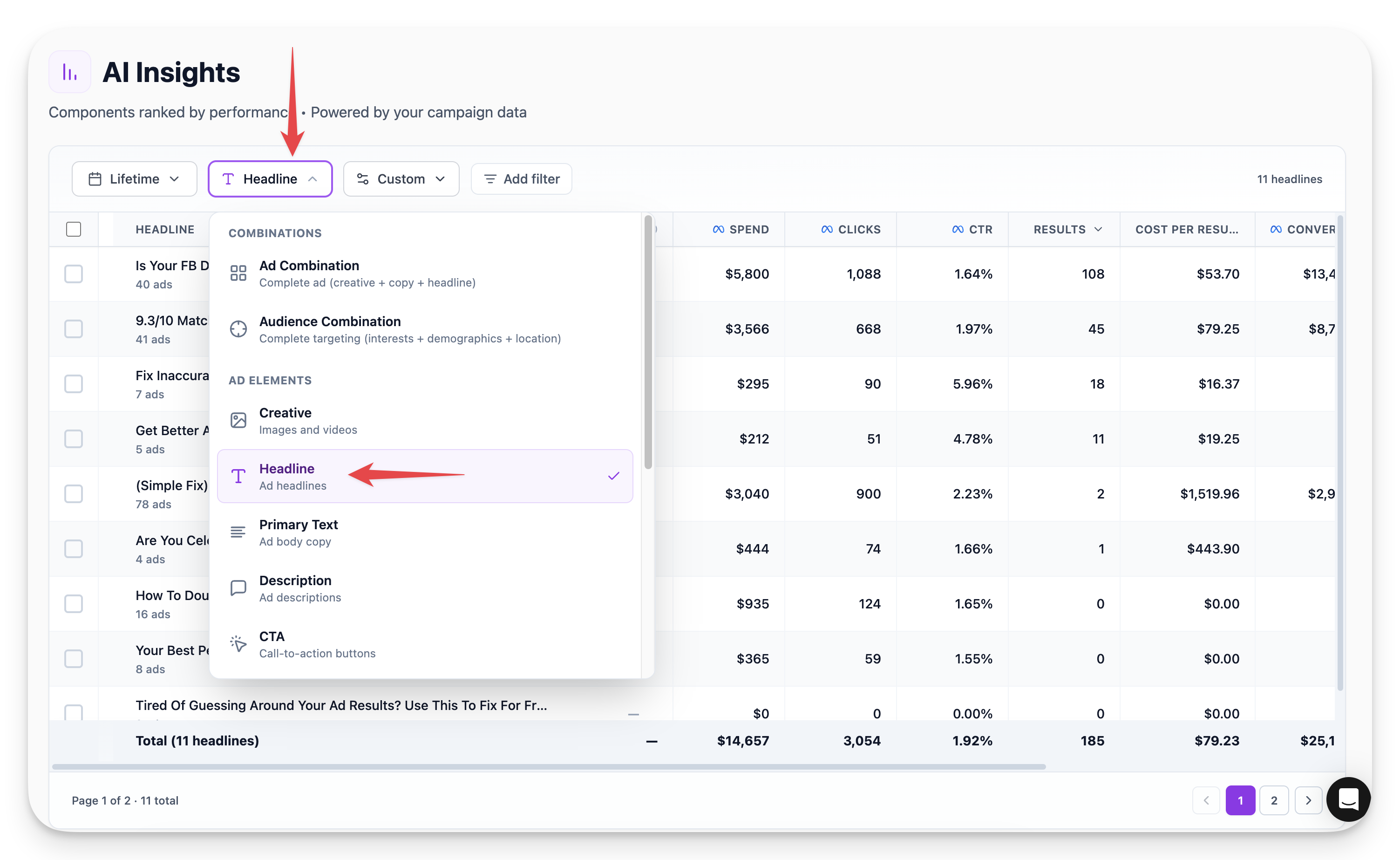 The Ad Combination view pulls everything together — creative, headline, copy — to show complete ad performance. Tips for using this view:- Sort by Results to see top performers