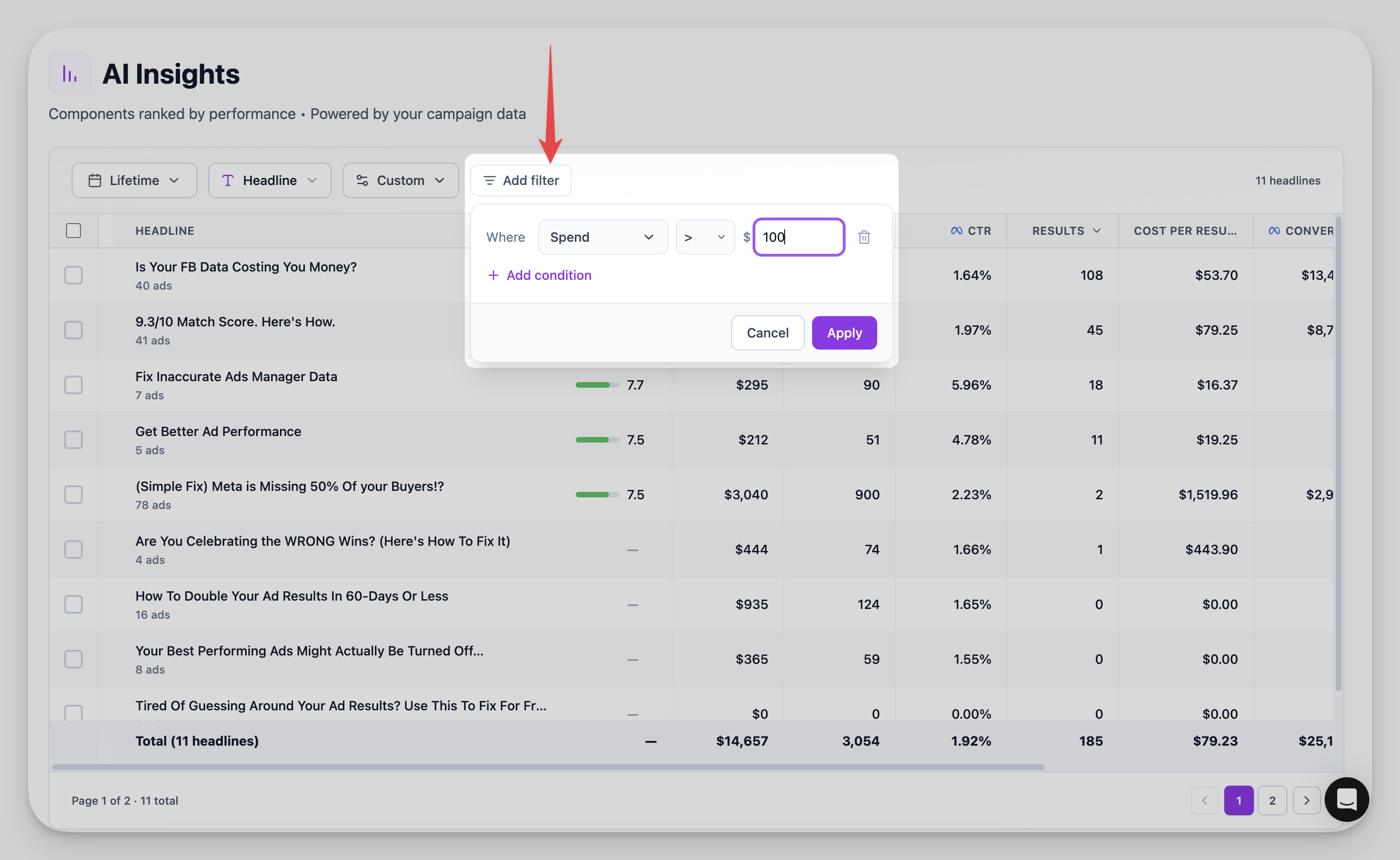 You can filter your data to focus on what matters most:- Filter by minimum spend threshold to exclude low-data ads