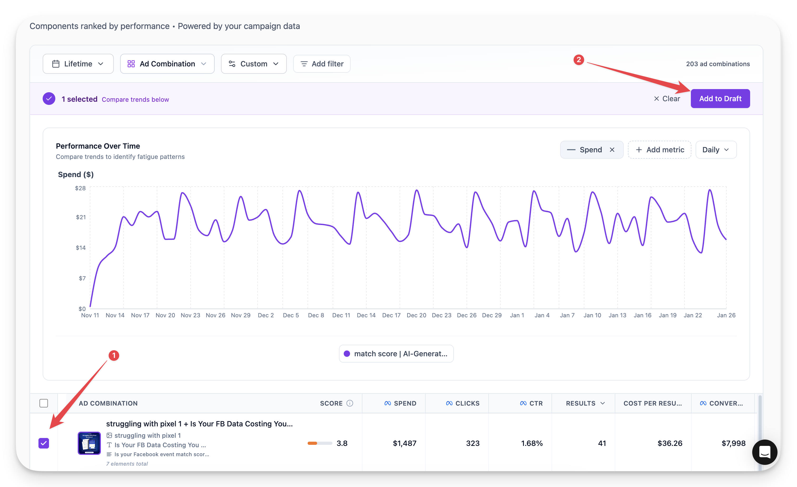- Select multiple ads for side-by-side comparison on the chart