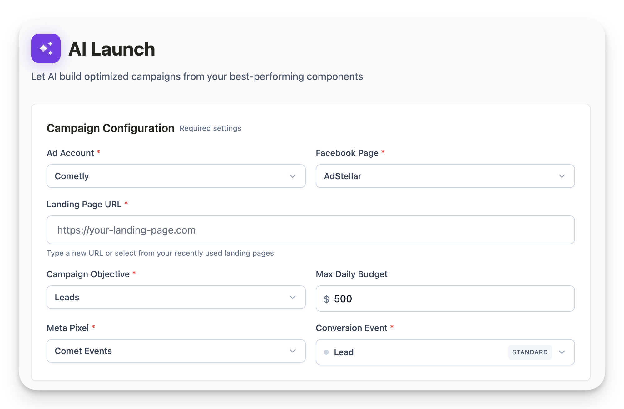 Seven specialized AI agents work together to build your campaign:- Page Analyzer: Reads your landing page to understand your offer, copy, images, and messaging. This ensures ad content aligns with what visitors will see.