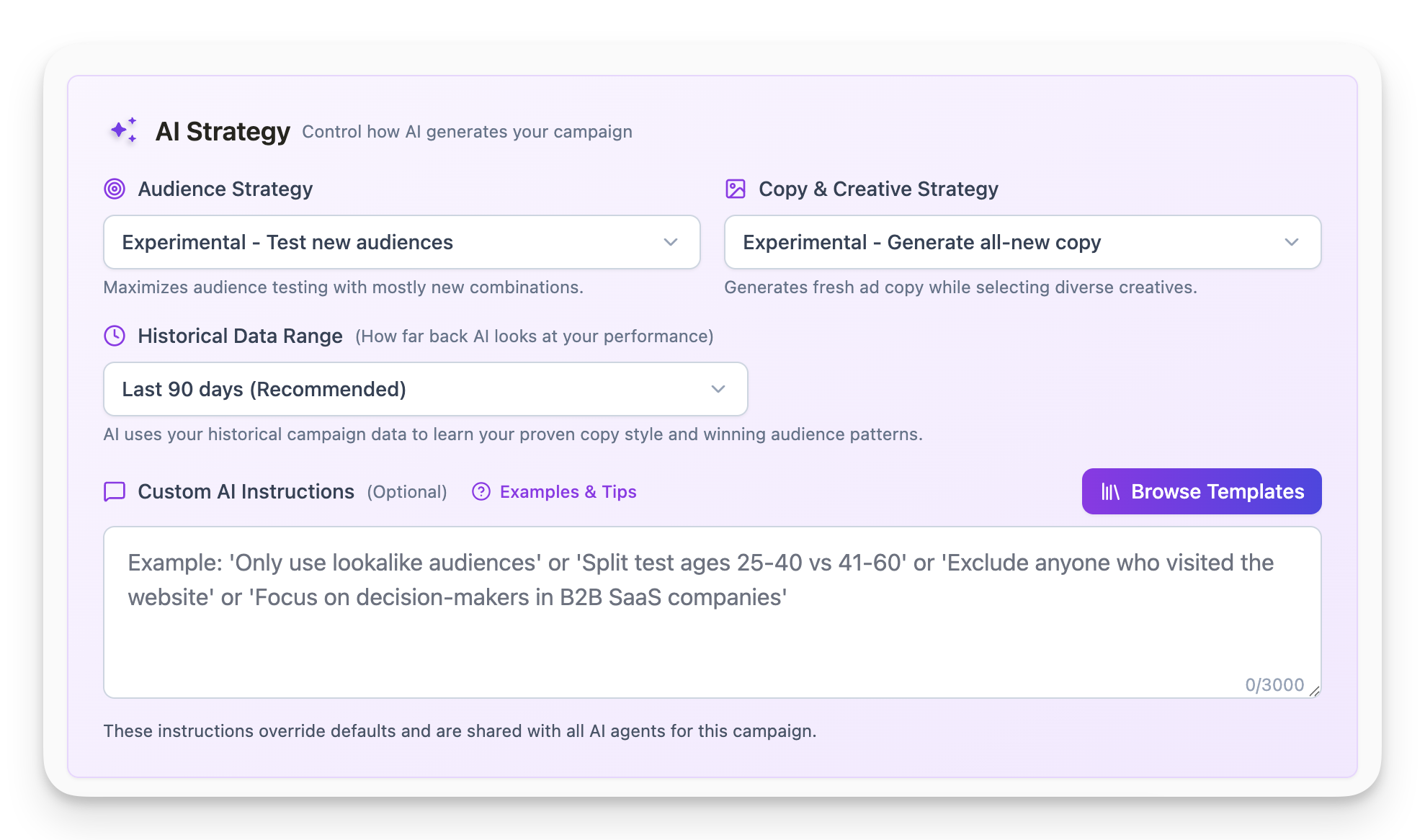 This is where you control how the AI builds your campaign.Audience Strategy