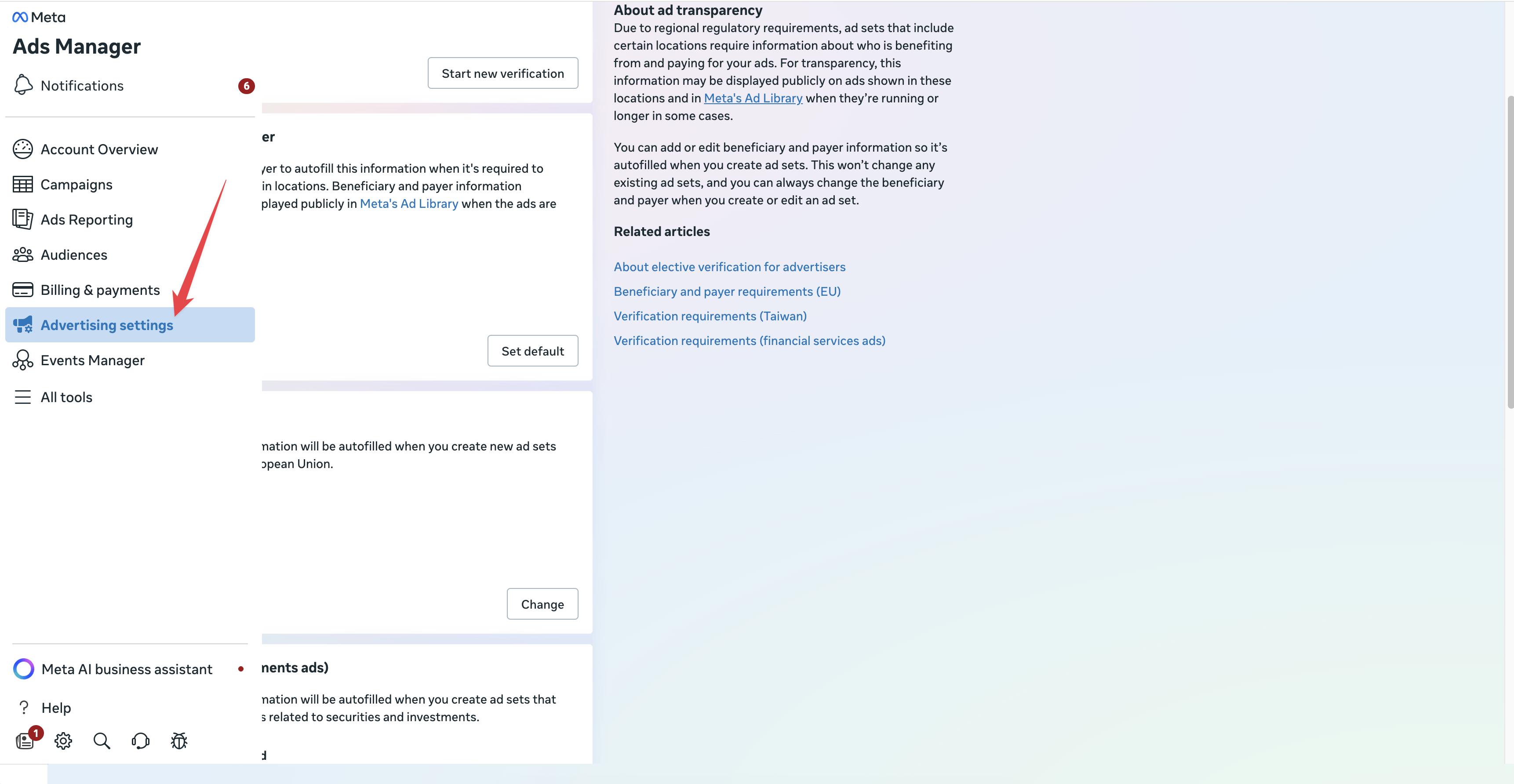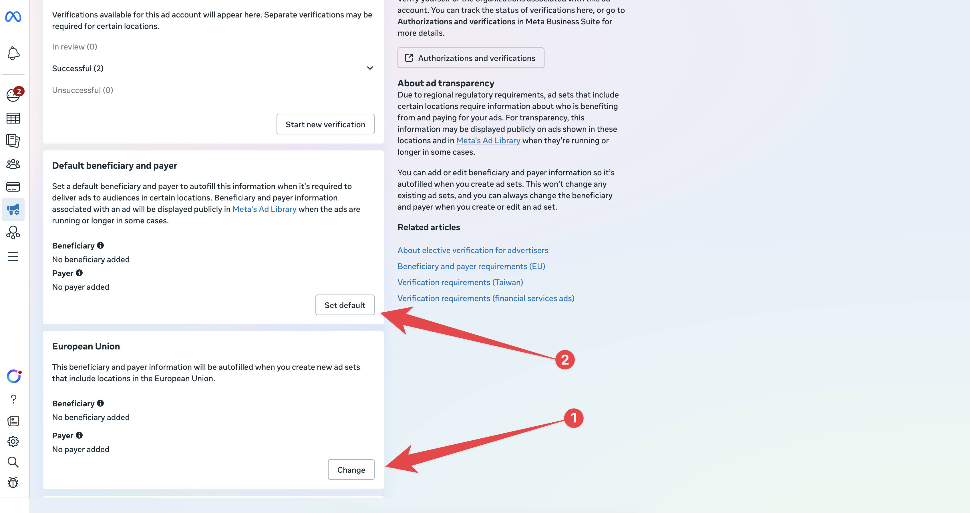 You’ll now see the Verifications and ad transparency page. Scroll down to the Default beneficiary and payer section. You’ll notice it currently shows “No beneficiary added” and “No payer added.”Find the “European Union” section (or the other countries you are looking to target: India, Australia, Singapore, Taiwan).Click Change (Step 1 in the image below):