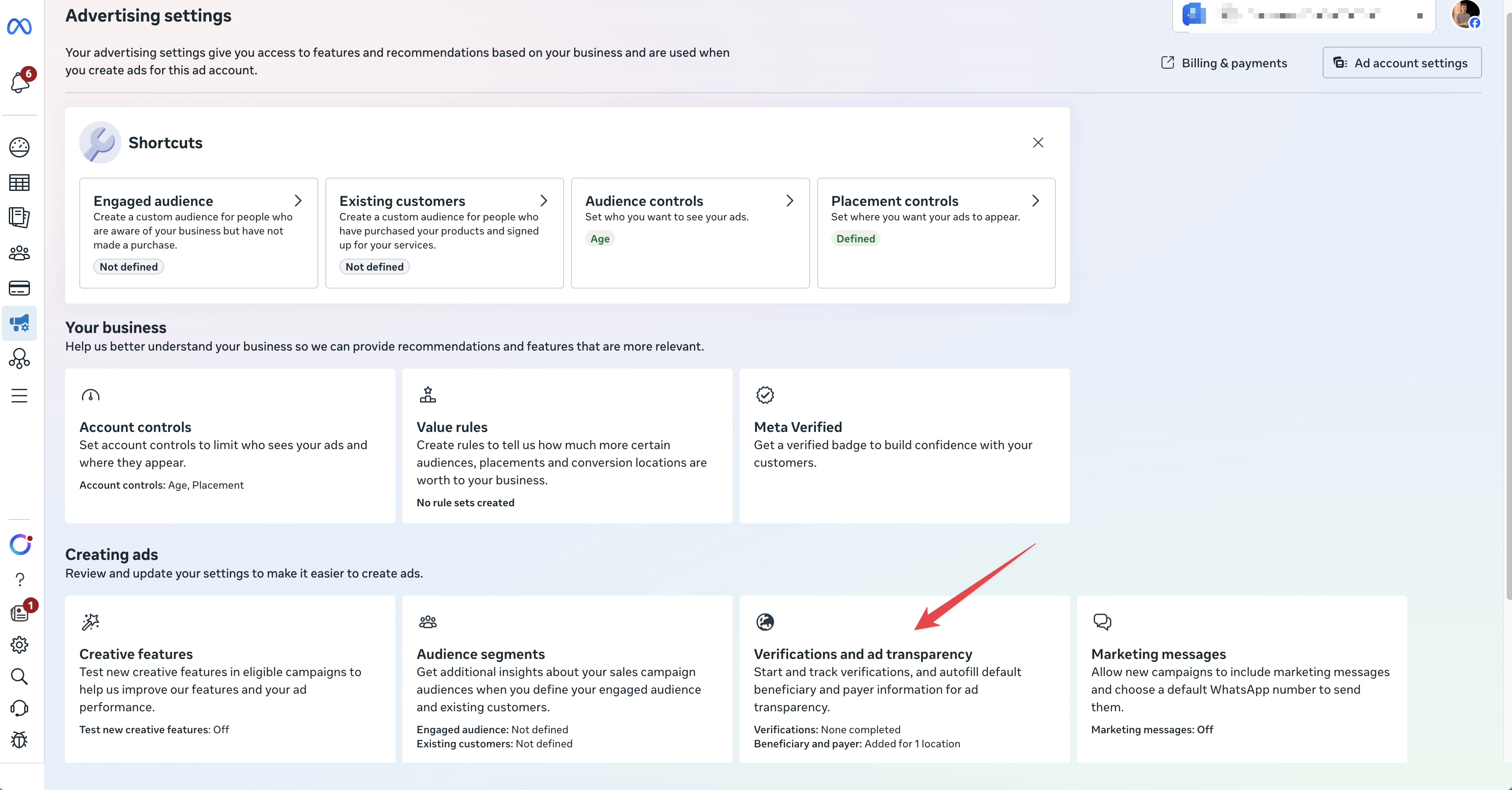 On the Advertising settings page, scroll down to the Creating ads section. Find the Verifications and ad transparency card and click on it.