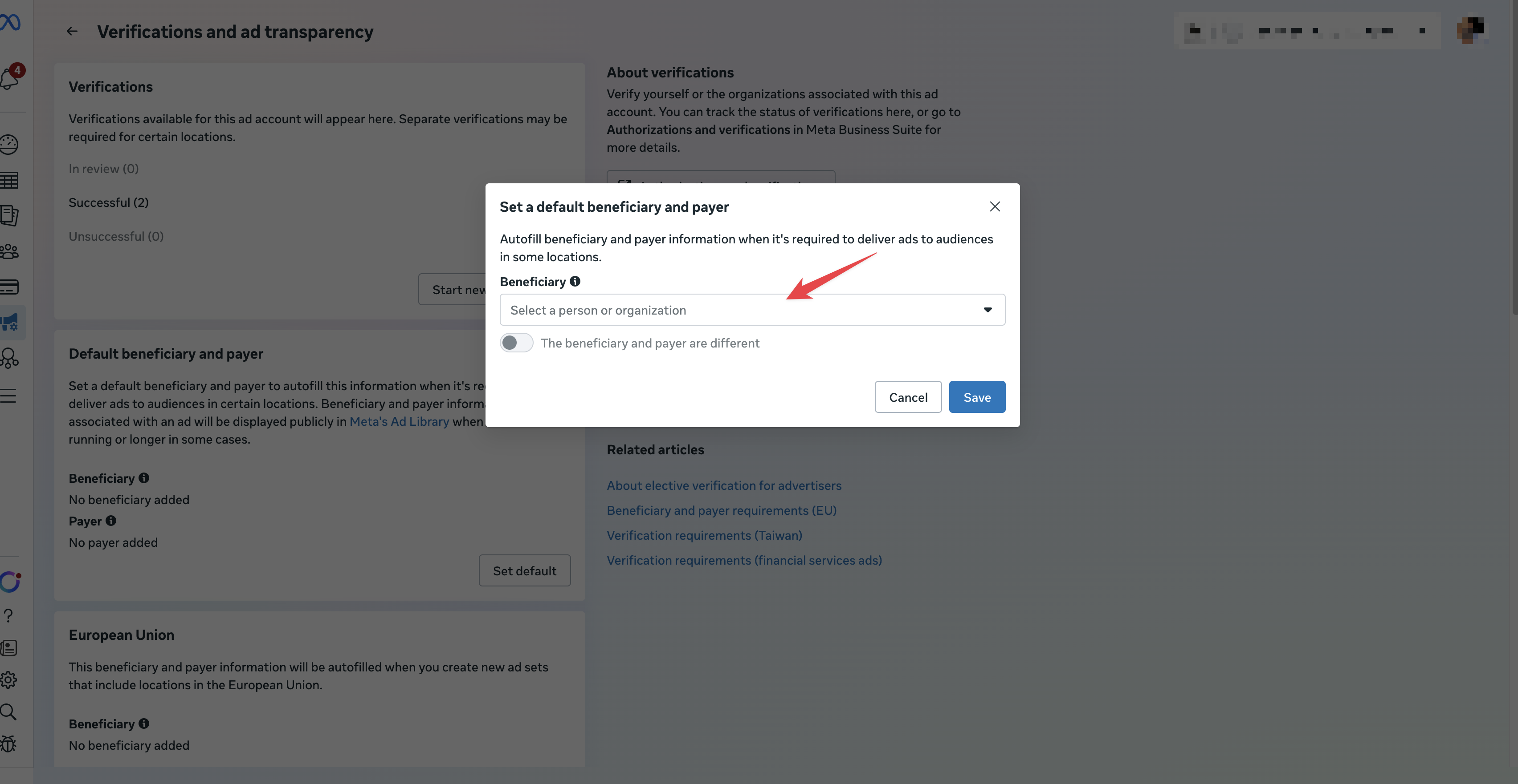 A modal will appear titled “Set a default beneficiary and payer.” Use the Beneficiary dropdown to select the person or organization that benefits from your ads. If the beneficiary and payer are different (for example, if an agency is paying on behalf of a brand), toggle on “The beneficiary and payer are different” and fill in both fields. Once you’re done, click Save.