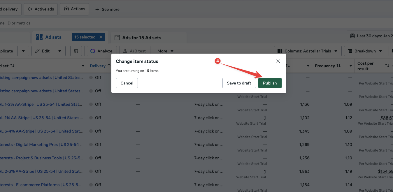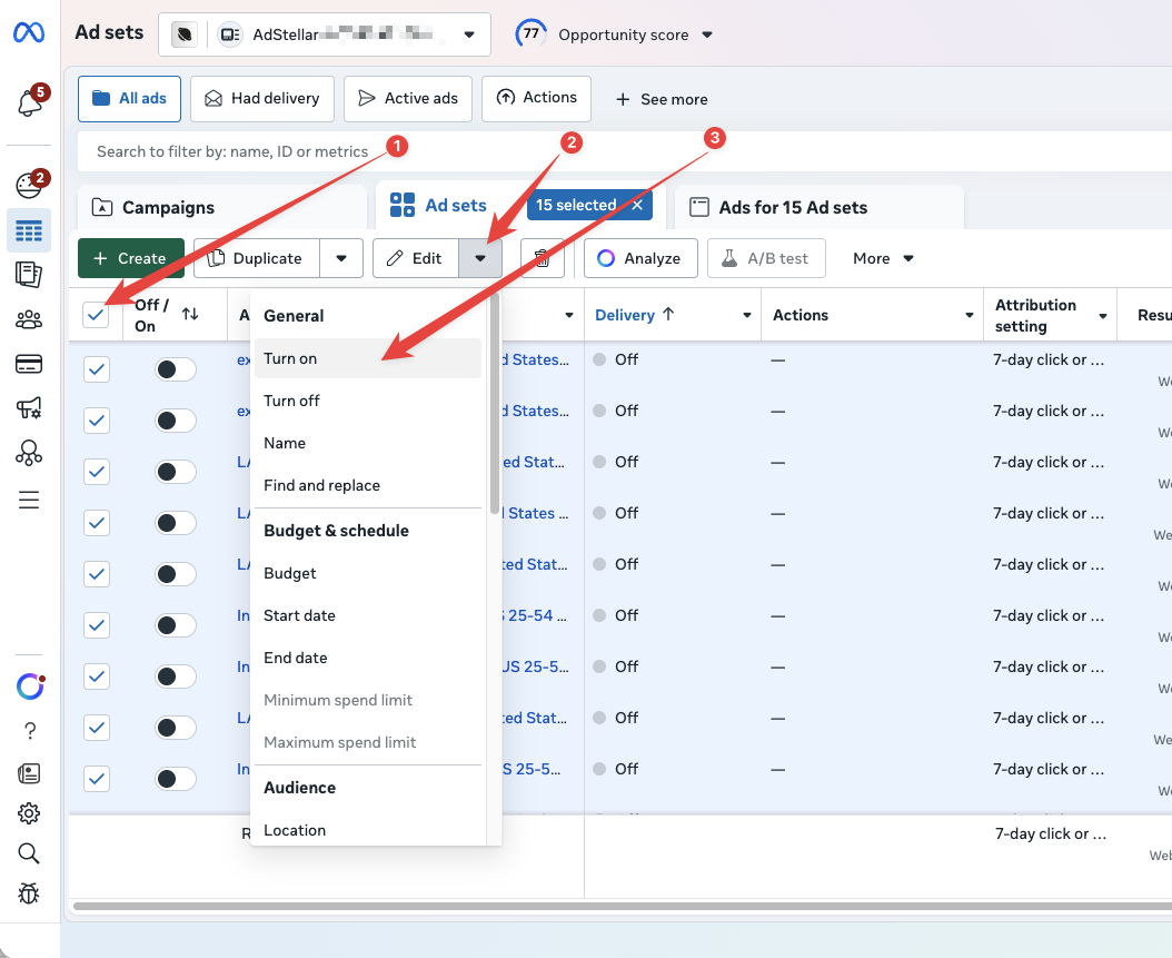 In the dropdown menu, click Turn on. This will turn on all of the selected ad sets at once.